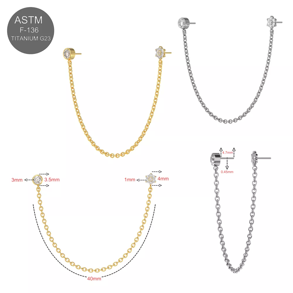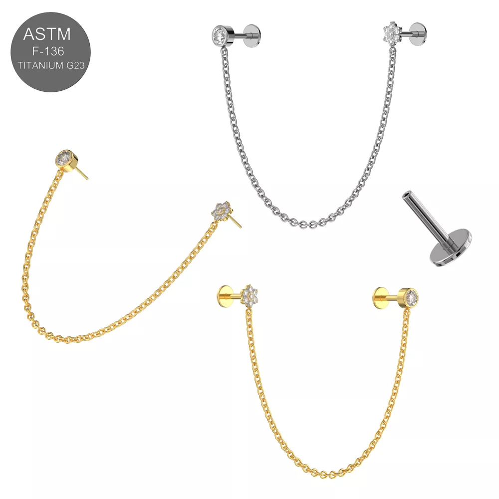 Dieses wunderschöne Labret ist aus hochwertigem Titan gefertigt, das sich durch Materialeigenschaften wie besonders gute Hautverträglichkeit und lange Haltbarkeit auszeichnet. Das eine Labret hat einen Push Fit Aufsatz in Form einer Blume und das andere Labret hat einen Push fit Aufsatz mit Kristallstein. Beide Labrets sind mit einem Kettchen verbunden.